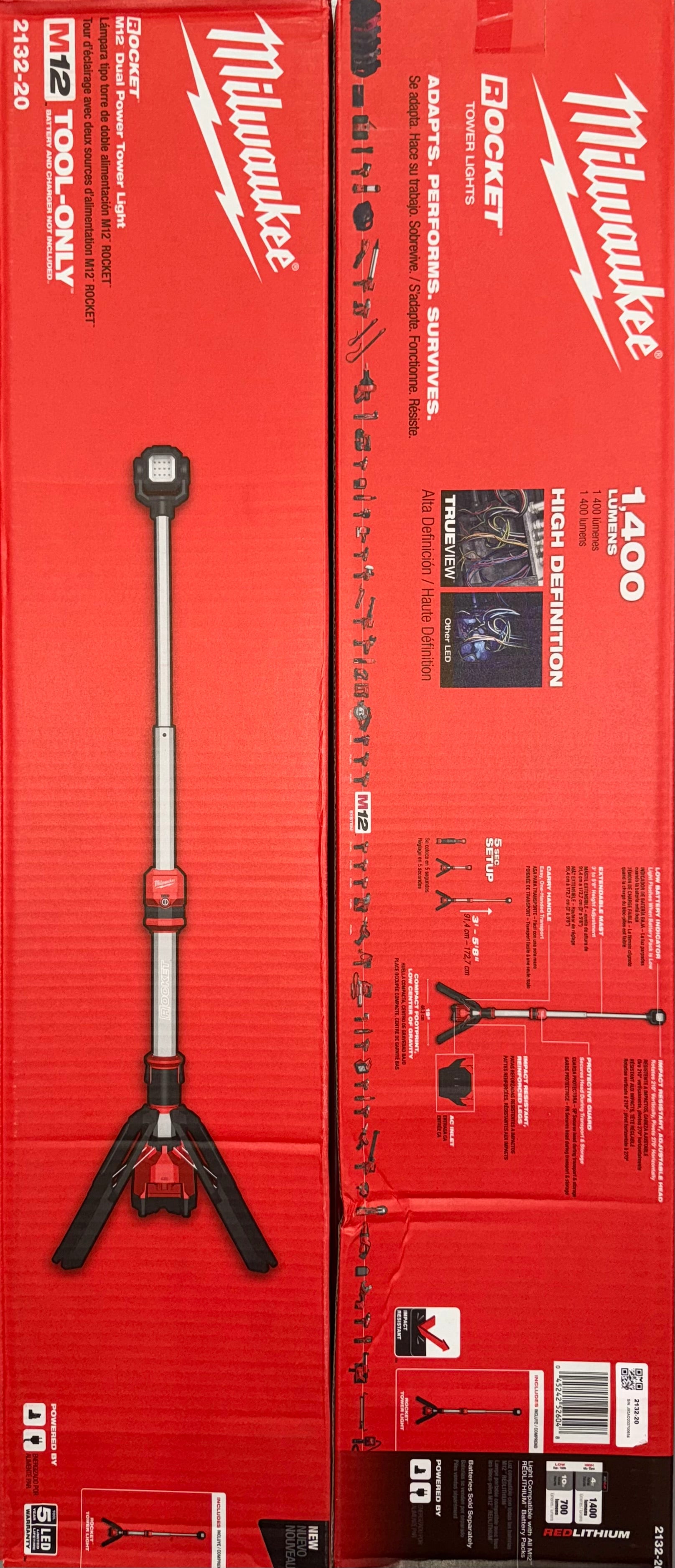 M12™ ROCKET™ Dual Power Tower Light is more portable and offers an all-day operation. The compact tower light is the lightest in its class with a 45% smaller footprint than our M18™ ROCKET™ Tower Lights. This allows you to easily carry and set it up in the most confined spaces. When not in use, the portable tower light collapses down to just 31" in length with three side handles allowing you to easily transport and store it. The LED tower light extends 5'8” to provide 1,400 Lumens of TRUEVIEW™ High Definition Output on high mode and 700 Lumens on low mode. The LED light tower head rotates 210° and pivots 270° allowing you to cast light in any direction. Our M12™ REDLITHIUM™ XC6.0 battery pack provides up to 10 hours of light on a single charge. The dual-powered light can also be plugged into an extension cord for all-day operation. After deployment, the portable tower light is supported by impact-resistant, reinforced legs that form a compact base with a low center of gravity to help survive any job site. The protective guard secures the head during transport and storage ensuring your tower light is always ready to use. The LEDs never need to be replaced and are backed by a limited lifetime warranty. MILWAUKEE® ROCKET™ Tower Lights are designed to deploy in seconds and are built to adapt to any job site environment. The LED tower lights supply both task and area lighting and provide light overhead to reduce shadows in the workspace.