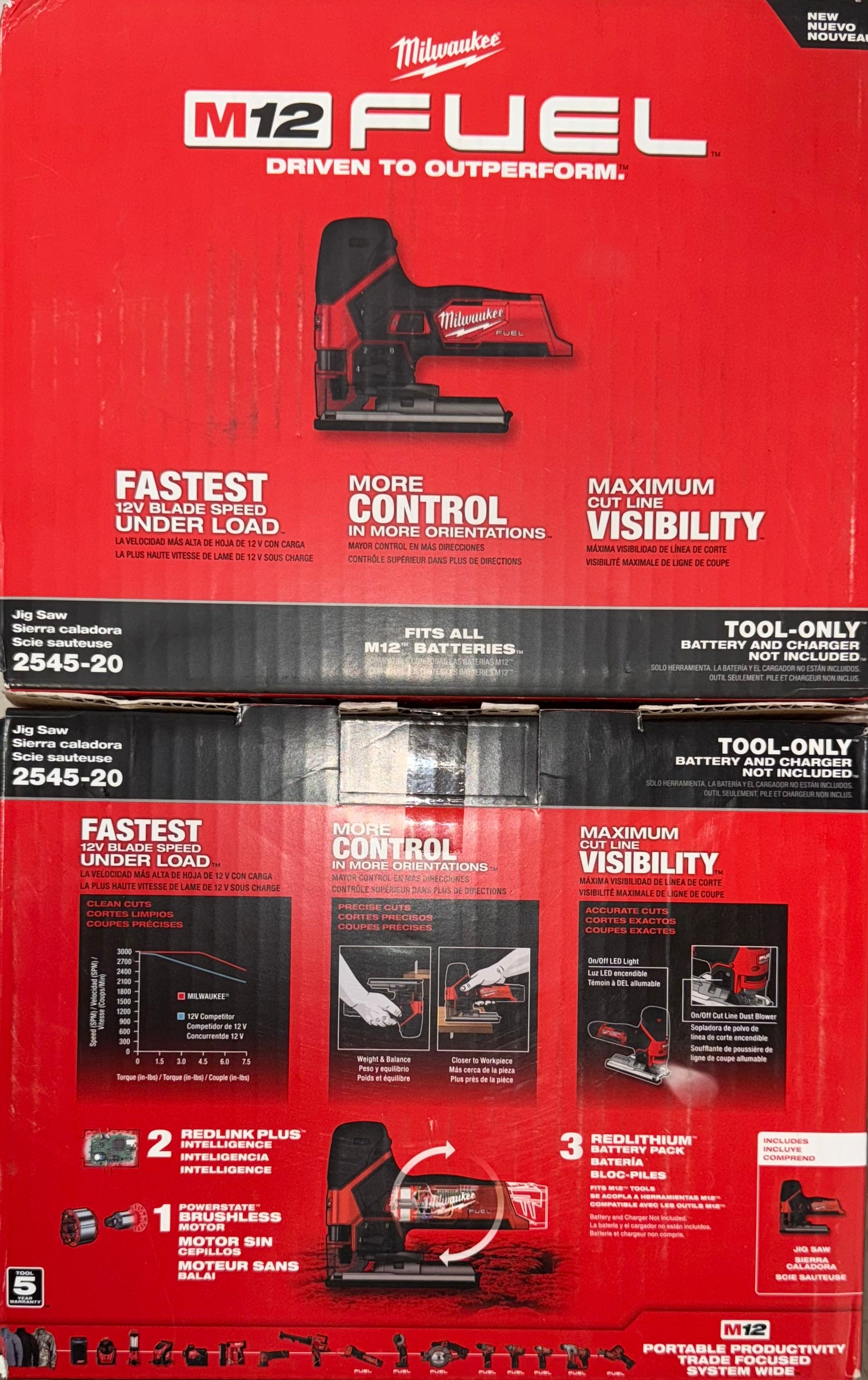 Designed for the professional carpenter and remodeler, the M12 FUEL Jig Saw is optimized for power and precision on the jobsite. The M12 FUEL™ Jig Saw delivers the Fastest 12V Blade Speed Under Load, More Control in More Orientations, and Maximum Cut Line Visibility. The POWERSTATE™ Brushless Motor and REDLINK PLUS™ Intelligence deliver 3000 strokes per minute at a 7/8" stroke for clean, controlled cuts in a wide variety of finish materials. The compact size, low vibration, and ergonomic barrel-grip design provide more control across standard and inverted orientations of usage. The saw is equipped with an on/off LED light and on/off dust blower to optimize cut line visibility for the application at hand. Our M12™ FUEL Jig Saw features orbital action with 5 adjustment levels, variable speed dial, blade storage, tool-less blade change, a durable aluminum base plate with bevel detents, and carries our industry-leading 5-year limited power tool warranty.