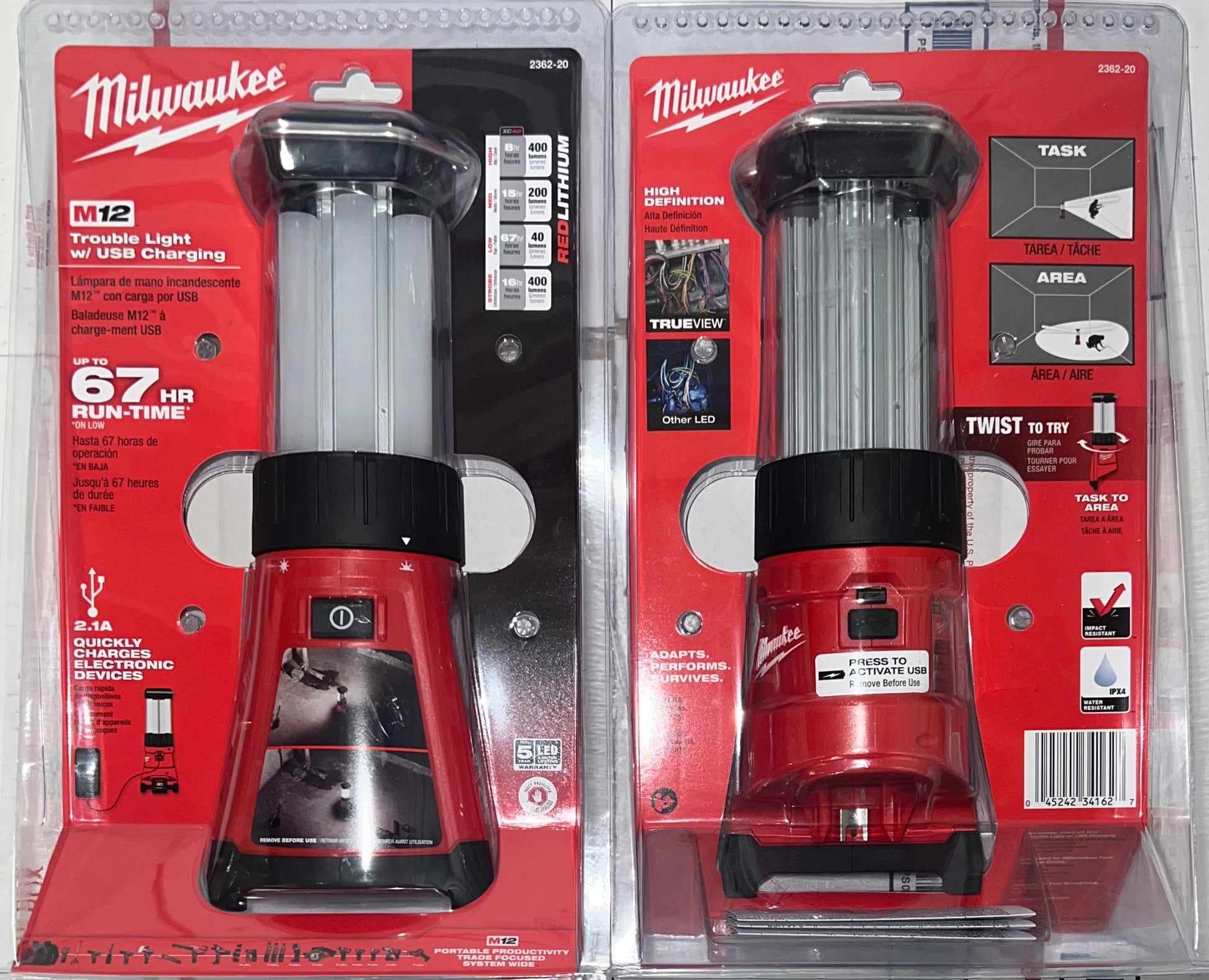 Trouble Light w/ USB Charging Light delivers you over 2 full days of light and features a 2.1A USB Port for USB charging anywhere. When paired with our M12™ REDLITHIUM™ XC4.0 battery, this LED trouble light provides up to 67 hours of run-time on low mode, and a full workday of light (8 hours) on high mode. It features a rotating collar that adjusts the light angle from task to area lighting and two stainless steel hanging hooks for maximum versatility. With 400 Lumens of TRUEVIEW™ High Definition Output, it delivers unmatched light output to illuminate work areas. The cordless trouble light also includes a high power 2.1A USB port to quickly charge tablets, smart phones, and other electronic devices. With a rugged design and an impact-resistant lens, the rechargeable LED trouble light is built to withstand abusive job site conditions. The MILWAUKEE® M12™ Trouble Light w/ USB Charging is compatible with all of our M12™ REDLITHIUM™ batteries (sold separately) and carries a Limited Lifetime LED Warranty so the LEDs never need to be replaced.