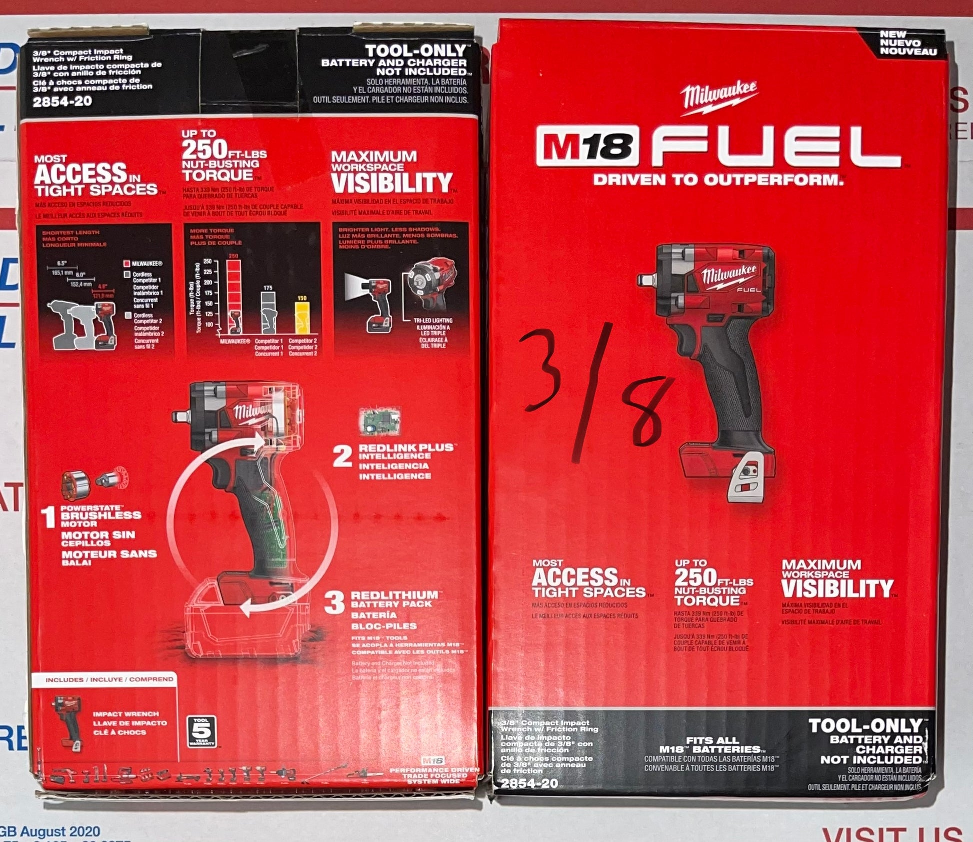 M18 FUEL™ 3/8" Compact Impact Wrench w/ Friction Ring is the most compact in its class, delivering you the most access in tight spaces, up to 250 ft-lbs of nut-busting torque, and maximum workspace visibility. This battery-powered impact wrench measures only 4.8" in length with a POWERSTATE™ Brushless motor to provide the power to remove stubborn fasteners, even in confined spaces. The MILWAUKEE® 3/8" Compact Impact Wrench has tri-LEDs that surround the anvil to deliver you brighter light with fewer shadows. 4-Mode DRIVE CONTROL™ offers greater precision with a range of pre-set RPM and IPM levels, selectable from a single button on the tool. By selecting Mode 4, AUTO SHUT-OFF™ control applies no more than 20 ft-lbs of torque for hand-tight fastening applications to prevent overtightening. Mode 4 also features Bolt Removal Control delivers full torque output, then decreases RPMs once the bolt is loosened to prevent fastener drops. REDLINK PLUS™ Intelligence electronics make these controls possible while ensuring maximum performance, protecting the tool against overloads, over-heating, and over-discharge. The M18™ REDLITHIUM™ battery pack (not included) fits M18™ tools, delivering more work per charge and more work over the life of the pack.