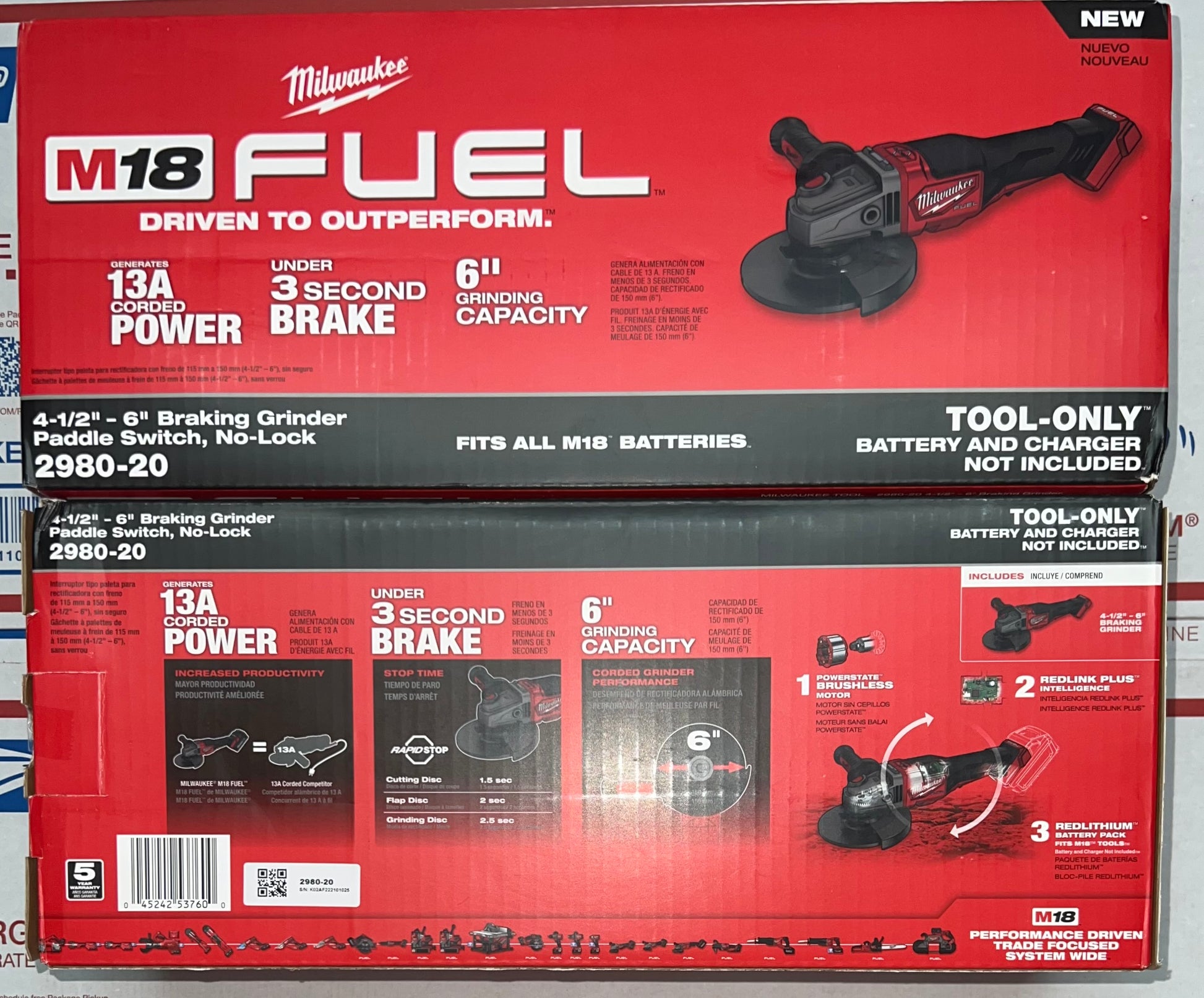 Milwaukee M18 Fuel 4-1/2”-6” Braking Grinder Paddle Switch, No Lock. Model #2980-20